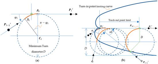 When the dyad of edges satisfies both the turn-in point and track–out point limit, we can apply a minimum diameter turn on the locations of critical turn-in point and critical track-out point individually. This operation is referred to as the normal cornering motion. The EV path according to the Voronoi path is decomposed into a series of G codes in which G01 stands for a linear segment, G02 denotes a clockwise circular segment, and G03 denotes a counterclockwise segment. All G01, G02, and G03 segments are assigned with the turn-in and track-out poses for IMR navigation. As shown in Figure 4b, the path between and is a G01 motion. The path between and is a G02 motion. Due to the discrete control requirement, we need to further subdivide the path segments into discrete poses as the IMR motion command on each time tick.