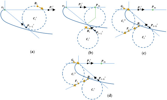 - Both the turn-in point limit and the track-out point limit fail: As shown in Figure 5c, we may find the set of intermediate poses , , and that first achieve the G03/G02 cornering motion from to connecting by a G01 linear motion from to and proceed to G02/G03 cornering motion from to followed by a normal cornering motion from to .