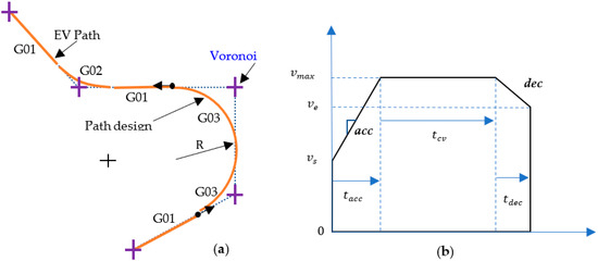 (a) Conversion of Voronoi path to motion path; (b) acceleration and deceleration for linear interpolation.