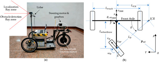 Figure 7a shows the image of the IMR with a 1.5 kW in-wheel BLDC motor as the traction motor which powers the vehicle forward or backward, spins the wheel, and transmits power to the ground. This traction model is used for a battery-powered electric vehicle where the gearbox, clutch, transmission shaft, universal joint, and anti-roll bar are no longer used. The LiDAR is fitted at the front axle at a height of 180 cm from the ground level. The ray zones from the LiDAR are divided into two regions: the upper zone is used for the localization task, while the lower zone is used for the object detection task. Figure 7b shows the body (or bogie) schematics of the IMR which is a three-wheeled vehicle with an axle in front and a rear wheel on the back. The vehicle system parameters are given in Appendix A. The configuration of the IMR yields a rear-wheel drive and rear-wheel steering system. The terms denoted in the following equations are depicted in Figure 7b. The IMR motion may be simplified in the velocity equation for as follows: