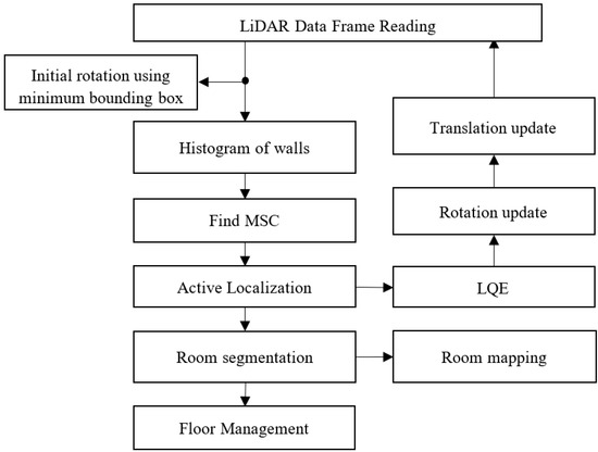 The software is implemented using a VLP_16 LiDAR with 16 rings made by Velodyne Inc. (San Jose, CA, USA). A remarkable contribution in IMR LiDAR localization in [2] consists in the fact that the authors use solely a single sensor source, i.e., LiDAR, for indoor exploration and localization of the robot. A flowchart of the e-SLAM algorithm is shown in Figure 8. The LiDAR is positioned onto the center of the front axle of the IMR with a total height of 180 cm from the ground as shown in Figure 7a. The resulting LiDAR images are shown in Figure 9a. The unprocessed LiDAR data are acquired from the Socket communication associated with VLP_16 devices. The LiDAR data are then reorganized into the mesh image for the construction of the vertical walls which are subsequently used to form the LiDAR pose frame. The contemporary most significant corner (MSC) is the origin of the LiDAR pose frame. The location of the IMR is shown in Figure 9a using a cross. We chose the top portion of the LiDAR rings at 1, 3, 5, 7, 9, 11, 13, and 15 degrees to form the wall. The frame rate is around 5–10 data frames per second for updating the IMR location. The total distance accumulated during the navigation is about 45 m. The maximum speed of the IMR is 200 cm/s, which is a medium speed in IMR applications. With the obstacle detection using the LiDAR rings at −1, −3, −5, −7, −9, −11, −13, and −15 degrees, the IMR comes to a halt due to passersby. At a height of 180 cm from the ground level, the LiDAR can detect obstacles more than 160 cm from the ground and 80 cm apart from the vehicle. Keeping the LiDAR sensor below 180 cm provides noise while collecting point clouds due to which the LiDAR localization algorithm fails to provide a reference point, i.e., the most significant corner (MSC).