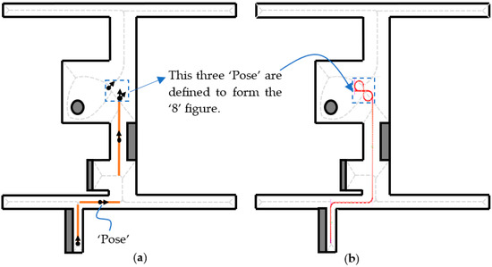 The Sidomotion software is implemented in VC6.0 according to Section 3 and Section 4. The software takes consecutive pose information (position and orientation) shown in Figure 10a as input. The intermediate vertices at the corner are then calculated to design the circular motion. The two pieces of pose information shown in the blue dotted squares are responsible for the “8” figure motion in Figure 10b. The red circles are the interpolation positions according to the linear and corner turning velocity input in the controller stated in the previous section. A dense sighting of the red circles at the corner turning depicts a slow velocity while on a linear motion; the far-placed red circles show an increase in velocity. The adjacent vertices are joined using the edge definition. One has to determine the best trajectory among the multiple trajectories between the starting and the destination vertex.