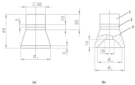 Three different configurations of Langevin-type ultrasonic transducers were developed. One of them had a cylindrical front mass with a flat ultrasound emitting surface (Figure 1a), and the other two had different diameters d1 of 59 mm and of 100 mm, respectively, with a ring-shaped front mass surface (Figure 1b). The design of the latter is based on three concepts: (1) the use of a front mass with a ring-shaped front mass surface produces stronger excitation; (2) the radial mode oscillation of the modified front mass produces a concentrated acoustic field; and (3) more acoustic energy is produced in the higher-frequency vibrational mode.