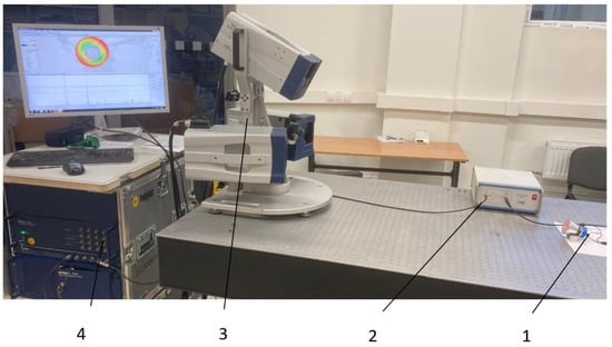 Set-up with Polytec PSV-500-3D scanning laser vibrometer: 1—transducer; 2—linear amplifier; 3—Polytec scanning laser head; 4—Polytec signal generator/data acquisition system.