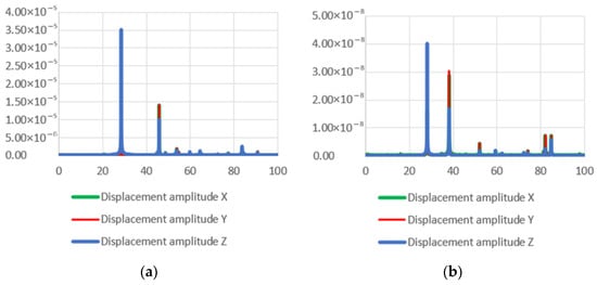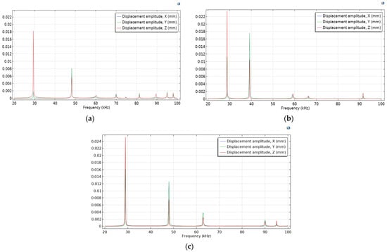 Numerical FEM simulations of the transducers were performed, and the vibration modes and resonant frequencies were determined using forced harmonic analysis. Three Langevin-type ultrasonic transducers with different front mass designs were investigated: two of them with diameters d1 of 58 mm and 100 mm and ring-shaped front mass surfaces and one with a flat front mass surface. The amplitude–frequency characteristics of the transducers with flat and ring-shaped front mass surfaces are presented in Figure 4 in the X, Y, and Z axis.