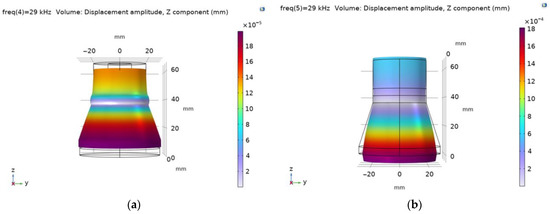 The modal shapes of the piezoelectric transducers with flat and ring-shaped front surfaces at the second natural frequency vibrations are presented in Figure 6.
