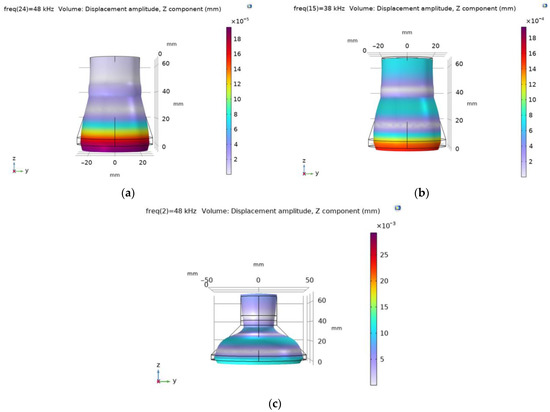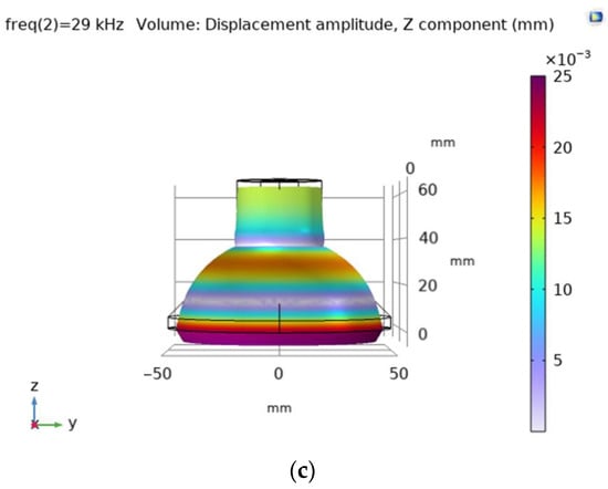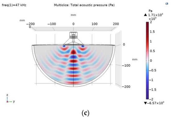 Theoretical amplitude–frequency characteristics of piezoelectric transducers using Comsol multiphysics: (a) with flat surface; (b) with ring-shaped surface with 59 mm outer diameter; (c) with ring-shaped surface with 100 mm outer diameter.