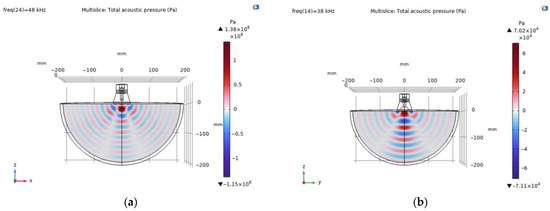 The propagation of acoustic waves in muscle excited by piezoelectric transducers with flat and cut-out surfaces in the first mode are presented in Figure 7.