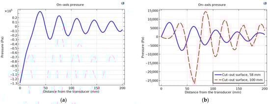 As illustrated by the graphs (Figure 9a), the total acoustic pressure of the ring-shaped surface transducer type is lower than that of the flat-surface transducer type, but it is more directional, which is very important when trying to use it in a real-world environment. However, the same Figure 9b shows that the acoustic pressure generated by a 100 mm ring-shaped transducer at a 6 cm depth in the muscle tissue is almost five times higher than the acoustic pressure of a 58 mm diameter ring-shaped surface transducer. When used to treat the human body, the more directional and precise the wave, the better the results that can be achieved, as only the part of the body being treated is affected, not the whole body. Furthermore, the longitudinal mode is not as suitable for medical applications as the radial mode because the stronger acoustic signal produced by the second natural frequency mode transducer can be focused on a specific depth of biological tissue. Asymmetry between positive and negative half-cycles can be seen for the simulations of acoustic pressure level distribution in the muscle medium, and it is caused by the non-linear propagation of the ultrasound wave in an interface layer between the transducer and the muscle tissue. Under such conditions, the peak rarefaction, pr, and peak compression, pc, or peak negative and peak positive pressure, respectively, are separately identified. In addition, only the peak rarefaction is used to estimate the risk of the sonicated tissue destruction due to the mechanical cavitation. In this case, a Mechanical Index (MI) is used, which is given by the following equation: MI = pr f0.5, wherein pr is the maximum negative peak pressure in units of MPa, and f is the center frequency of the ultrasonic wave in units of kHz. Thus, it is a frequency-weighted acoustic pressure value, and it indicates the likelihood of cavitation when the MI is higher than 0.6. Therefore, the very high peak negative acoustic pressure generated by the flat surface transducer in an interface layer between the transducer and muscle tissue (Figure 9a) can induce tissue destruction by cavitation.