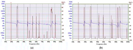 Experimental impedance–phase vs. frequency characteristics: (a) the electric impedance of the transducer with flat surface; (b) the electric impedance of the transducer with ring-shaped surface.
