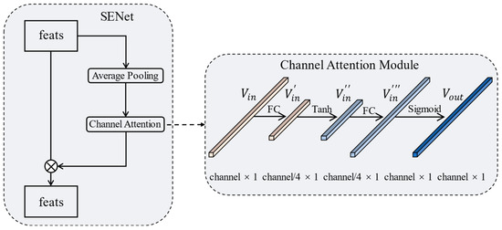 We add the SENet structure based on FPN. The model achieves a channel-level self-attention enhancement through this structure. During the training process, the model continuously learns to improve the representation of hard support samples. The design of SENet is shown in Figure 4. This module adds a skip connection to the output feature layer of the ResNet forward network. In the connection, the feature maps are first average pooled. Then, the channel attention scores are obtained through the channel attention module. Finally, the original feature maps are weighted at the channel level through the scores. The internal structure of the channel attention module is shown on the right side of Figure 4. The input feature vector is first dimensionally decreased through the first fully connected (FC) layer with a reduction rate of 4 to obtain . Then, is followed by the first activation function Tanh to obtain . Then, the dimension of is increased through the second FC layer to obtain . Finally, is followed by the second activation function sigmoid to obtain the weight score vector .The whole process can be summarized as: