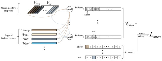 The essence of the attention loss lies in utilizing the support features to establish a mapping between query-positive proposal features and their corresponding categories. Through training, a strong response is generated between objects of the same category in two branches. The model learns to recognize objects of the same category in two branches while also discriminating objects of different categories. As shown in Figure 5, we extract all query-positive proposal feature vectors according to the intersection over union (IOU) between the predicted bounding boxes generated by the RPN and the ground truth. We then perform a matrix multiplication operation between all positive proposal feature vectors and the transpose of the support feature vectors and put them through softmax to obtain attention vectors , where denotes the number of input support images in each iteration. Each element in represents a support category. Suppose the category of the positive proposal is consistent with that of the support vector. In that case, we expect the value of the element position corresponding to this category to be close to 1; otherwise, it is close to 0. To achieve the goal above, we concatenate all the attention vectors together to obtain the score matrix , where is the numbers of positive proposals, and corresponds to each positive proposal to constrain the trend of , that is, the proposed attention loss: