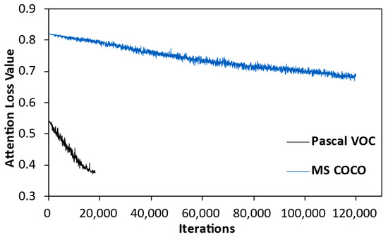 The convergence curves of the changes in attention loss with the number of iterations. The black and blue curves in the figures represent the convergence on the Pascal VOC and MS COCO datasets, respectively.