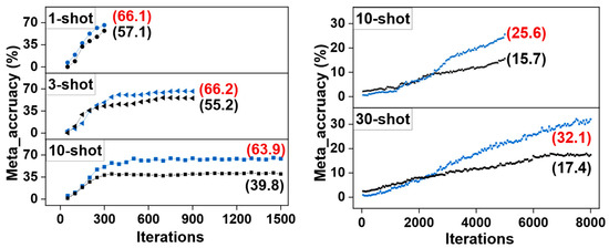 The meta accuracy achieved by the MSFFAL and baseline on the Pascal VOC (left) and MS COCO (right). The black and blue curves in the figures represent the baseline and MSFFAL, respectively.