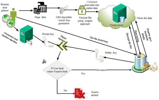 The proposed design of security management in smart healthcare management is illustrated in Figure 1. The COVID data were collected locally and globally by IoT-based sensors, which was helpful for electronic medical records administration. The serpent (S) encryption technique based on LRO to protect data transfer from sensed data was applied. The LRO algorithm created the secure key for the serpent algorithm. The wearable IoT device stored its acquired data on a cloud server and was open to hacker attacks and privacy violations from unauthorized users. The asymmetric hash signature function was validated in the intelligent healthcare management system for critical validations from the sender and receiver. If both perform the same position, only the secret key was sent to the recipient, who may then use it to decode the data. A similar process was used for hospital-based medical professionals.