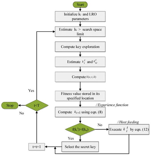 In this instance, was used to denote a little movement associated with the volume space of the host and secret key. The position of the secret key was to differentiate between the functions of the host and secret key in the solution space, and the position of the secret key was constrained using a secret key factor. If the host had a volume of 1, the volume of the secret key was about a portion of the host’s volume. Once the ideal answer had been found, the function ceased; otherwise, it continued for the following iteration. Figure 2 provides the LRO algorithm flowchart.