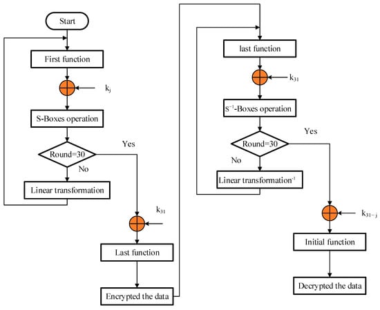 Decryption: Inverse S-boxes, an inverse linear transformation, and the subkeys’ reversed order are all necessary for decryption, which sets it apart from encryption. The flowchart of the serpent security approach is illustrated in Figure 3.