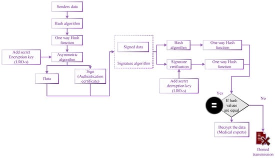 The security of this system is improved more than by the encrypted hash function. If the hash function of both senders and the medical experts are the same, then only they can access the data. A key generation technique randomly chooses one private key from a list of potential private keys. The LRO algorithm produces the private key and a matching public key. A signature-producing signing method generates a signature from data and a private key. The process for validating signatures either accepts or denies the data’s claim to authenticity depending on the data, public key, and sign. The signing algorithms establish a one-way hash of the digital data that has to be signed to create a digital signature. The hash value is, subsequently, encrypted by the signing method using the private key. The signature consists of this encrypted hash and other details such as the hashing technique. Finally, the data are transmitted to the verifier with this signature attached. Because a hash function may transform any random input into a much smaller fixed-length result, it is preferable to encrypt the hash rather than the entire message or document. Therefore, it will help to save time, since one must now sign a smaller hash value instead of a lengthy document, and hashing is considerably quicker than signing. The same hash function produces a hash value from the received data. The signature is legitimate if they are both equivalent; otherwise, it is illegitimate. The flowchart of the proposed Asymmetric Hash Signature is illustrated in Figure 4.