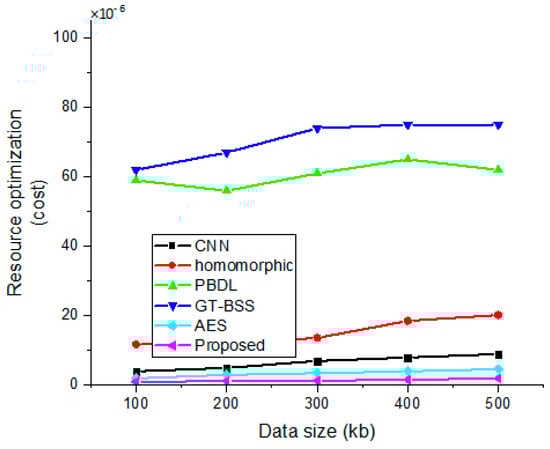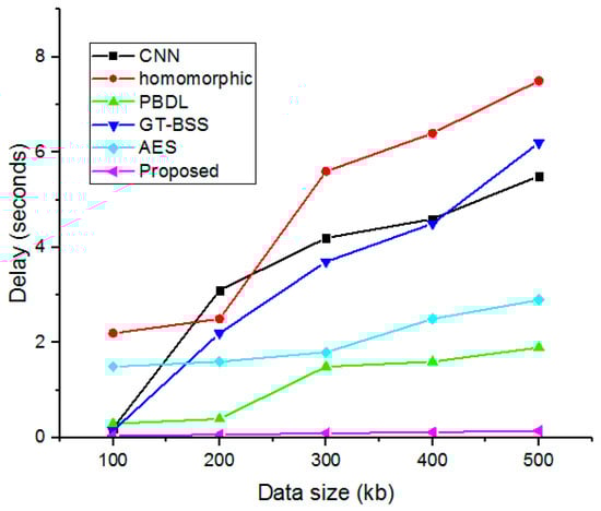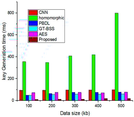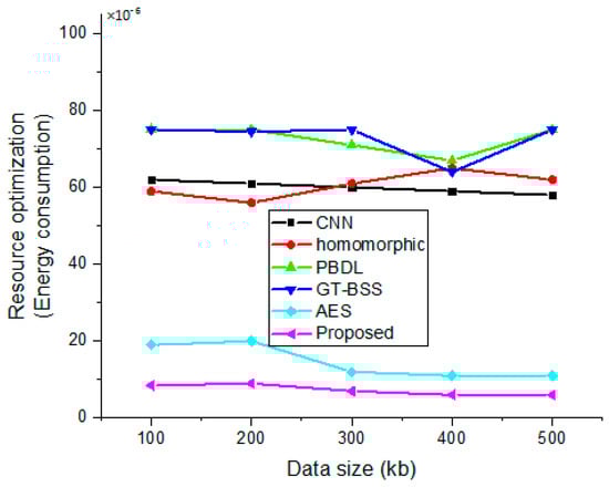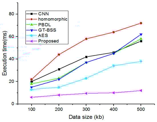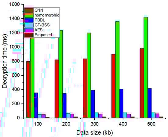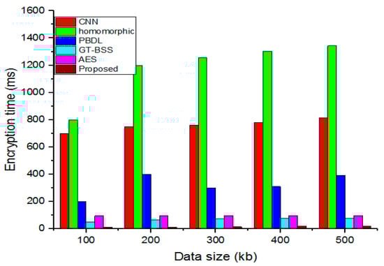 The proposed method was compared with the different conventional methods such as CNN [], homomorphic [], PBDL [], GT-BSS [], and AES [] in terms of encryption time, decryption time, resource optimization, execution time, delay, key generation, and so on.