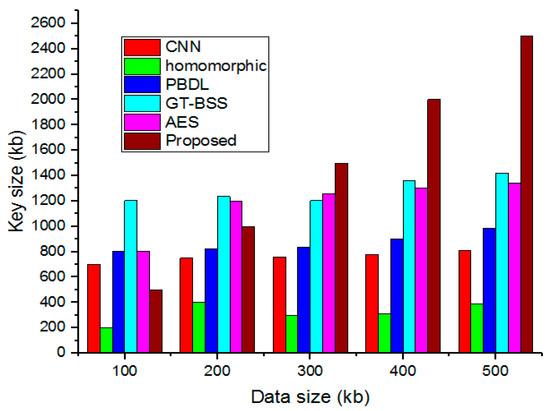 Keys regulate a cipher’s operation; only the correct key can decrypt a communication and reveal its plain text content. Since many encryption methods are based on or made publicly available, the system’s security, assuming no analytic attack, is only decided by how difficult it is to obtain the key. Therefore, estimating key size is crucial since it establishes the number of bits in a key that a security method will use. Figure 8 provides the comparative analysis for key size.