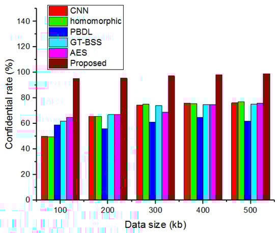The confidential rate is based on the differential between data that is sent and received during a data transfer. Figure 9 compares the performance analysis of the suggested confidential rate with the traditional approaches. The proposed system’s validation of the confidential rate is estimated for various file sizes. The conventional method has, however, become much less secretive over time. The results demonstrate how well the suggested model’s security function works.