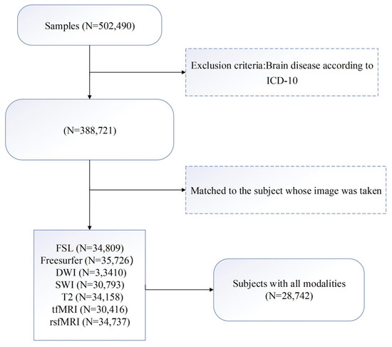 In the current study, IDPs [28] created by UKB were employed. They were chosen by looking through the data showcase (http://biobank.ctsu.ox.ac.uk/crystal/index.cgi, accessed on 11 January 2021). The preprocessing details of those IDPs were described in https://biobank.ctsu.ox.ac.uk/crystal/crystal/docs/brain_mri.pdf, accessed on 11 January 2021. Table 2 provides a brief summary of the definition of IDPs. The IDPs from six modalities were divided into seven feature sets, two of which (Freesurfer-based and FSL-based) were derived from T1 MRI.