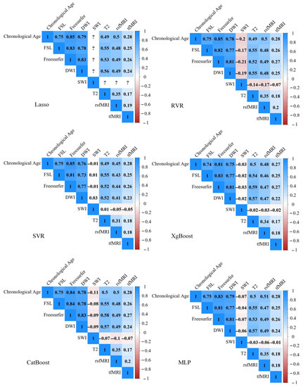 Figure 4 shows the correlation matrix of chronological age and estimated brain age of multi-modal images via six ML algorithms. The brain ages predicted by these ML models are highly correlated not only with each other but also with chronological age.