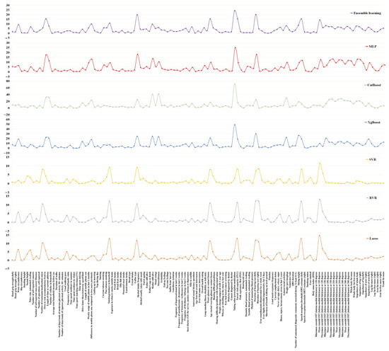 Lasso is a regression method proposed by Tibshirani [29] to address the problems of over-fitting and multicollinearity in ordinary least square regression (OLS). The penalty regularization parameter alpha in Lasso is responsible for regulating the penalty’s severity. The higher the value, the stronger the penalty for each parameter, which results in greater shrinkage of the coefficient sizes. The grid search space for the parameter alpha was specified as (0.001, 0.01, 0.1, 1, 10, 100).