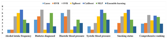 To further evaluate the interpretability of the BrainAGE, we investigated its sensitivity to five non-IDPs commonly identified in BrainAGE research. We ranked the performance of seven ML algorithms based on their correlation coefficient (r) with these variables, as shown in Figure 6. We then calculated a comprehensive ranking to provide an overall assessment of each model’s performance. Notably, we observed varying degrees of sensitivity to these non-IDPs, among the ML models, suggesting that their impact on the BrainAGE is not uniform. Our results indicate that Lasso regression and ensemble learning models achieved the highest rank in the comprehensive evaluation.