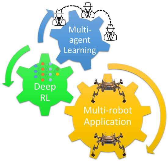 In a multi-robot application, several robots are usually deployed in the same environment [1,2,3]. Over time, they interact with each other via radio communication, for example, and coordinate to complete a task. Application areas include precision agriculture, space exploration, and ocean monitoring, among others. However, in all such real-world applications, many situations might arise that have not been thought of before deployment, and, therefore, the robots must need to plan online based on their past experiences. Reinforcement learning (RL) is one computing principle that we can use to tackle such dynamic and non-deterministic scenarios. Its primary foundation is trial and error—in a single-agent setting, the agent takes an action in a particular state of the environment, receives a corresponding reward, and transitions to a new state [4]. Over time, the agent learns which state–action pairs are worth re-experiencing based on the received rewards and which ones are not [5]. However, the number of state–action pairs becomes intractable, even for smallish computational problems. This has led to the technique known as deep reinforcement learning (DRL), where the expected utilities of the state–action pairs are approximated using deep neural networks [6]. Such deep networks can have hundreds of hidden layers [7]. Deep reinforcement learning has recently been used in finding a faster matrix multiplication solution [8], for drug discovery [9], to beat humans in Go [10], play Atari [6], and for routing in communication networks [11], among others. Robotics is no different—DRL has been used in applications ranging from path planning [12] and coverage [13] to locomotion learning [14] and manipulation [15].