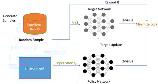 One of the most popular extensions of DQN is Double DQN (DDQN) [37], which reduces overestimation in Q-learning. DDQN uses the Q-network for action selection following the -greedy policy, as mentioned above, but uses the target network for the evaluation of the state–action values. DQN and DDQN are extremely popular in robotics [13,38,39,40,41]. A visual working procedure of the generic DQN algorithm is presented in Figure 3.