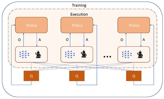 For multi-agent DQN, a common experience memory can be used, which will combine the transitions of all the agents, and, consequently, they will learn from their global experiences while virtually emulating a stationary environment. Each agent can have its own network that will lead it to take an action from its Q-values [59]. Yang et al. [60] have proposed a mean field Q-learning algorithm for large-scale multi-agent learning applications. A mean-field formulation essentially brings down the complexity of an n-agent learning problem to a 2-agent learning problem by creating a virtual mean agent from the other agents in the environment. In [61], the authors have introduced the multi-agent extension of DDPG (MADDPG). Here, the actor remains decentralized, but the critic is centralized. Therefore, the critic needs information on the actions, observations, and target policies of all of the agents to evaluate the quality of the joint actions. Figure 4 shows an illustration of this process. Yu et al. [62] have proposed a multi-agent extension of PPO in cooperative settings (MAPPO). Similar to MADDPG, it uses centralized training with a decentralized execution strategy.