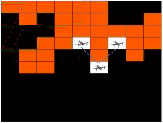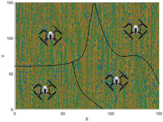 The goal of an MRS in a coverage path planning (CPP) application is that every point in the environment is visited by at least one robot while some constraints are satisfied (e.g., no collision among the robots) and user-defined criteria are optimized (e.g., minimizing the travel time) [145]. CPP is one of the most popular topics in robotics. For multi-robot coverage, several popular algorithms exist even with performance guarantees and worst-case time bounds [146,147,148,149]. In exploration, however, the objective might not be the same as the multi-robot CPP problem. It is assumed that the sensor radius , and, therefore, the robots do not need to visit all the points on the plane. For example, the robots might be equipped with magnetic, acoustic, or infrared sensors in ground and aerial applications whereas a group of underwater vehicles might be equipped with water temperature and current measuring sensors. The robots will need GPS for outdoor localization. Such exploration can be used for mapping and searching applications among others [150,151,152]. Constraints such as maintaining wireless connectivity for robots with limited communication ranges might be present [153]. Inter-robot communication can be achieved via ZigBee or Wi-Fi. An example is shown in Figure 6.