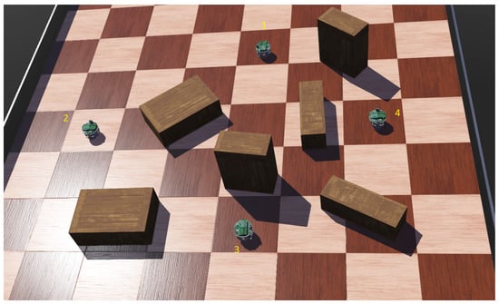 An illustration of multi-robot path planning with 4 e-puck robots, where the starting positions are shown and each robot’s goal position is its orthogonal robot’s starting location. The boxes represent the obstacles in the environment.