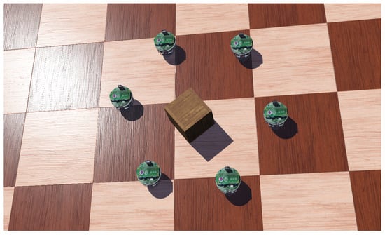 Navigation of a swarm of robots through a complex environment is one of the most researched topics in swarm robotics. To have a stable formation, each robot should be aware of the positions of the nearby robots. A swarm consisting of miniature robots might not have a sophisticated set of sensors available. For example, a compass can be used to know the heading of the robot. Additionally, range and bearing sensors can also be available [213,214]. Infrared sensors can be used for communication in such a swarm system [215]. Inspired by swarms of birds or schools of fish, robots usually follow three simple rules to maintain such formations: cohesion, collision avoidance, and velocity alignment [164]. It is no surprise that multi-agent deep reinforcement learning techniques have been extensively employed to mimic such swarm behaviors and solve similar problems. An illustration of forming a circle with a swarm of five e-puck robots is presented in Figure 9.