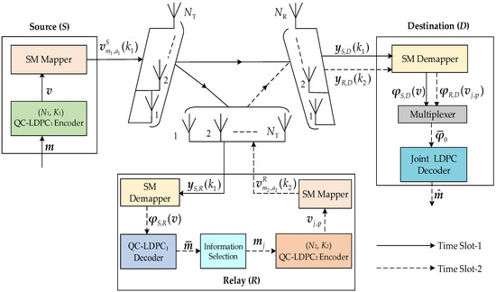 Figure 3 exhibits the D-QC-LDPCC-SM system model, in which the source (S) and relay (R) adopt different 5G LDPC codes. The R uses the decode-and-forward protocol. Additionally, the S, R and destination (D) deploy NT, NT and NR antennas, respectively. Completing a whole system transmission requires two time slots.