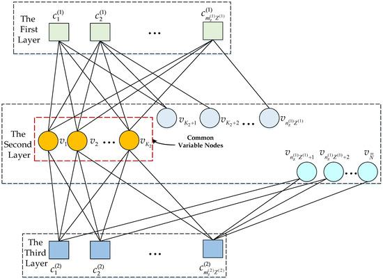 where H1 is the parity-check matrix of the 5G (N1, K1) QC-LDPC1 code, and H2 = [Q, F] is the parity-check matrix of the 5G (N2, K2) QC-LDPC2 code at R with Q and F separately having the sizes , . If the selected bits are not in the first positions, then matrix Q is not necessarily in the first columns. For the convenience of discussion, we directly use the parity-check matrix in Equation (16) to analyze the decoding process, and the corresponding three-layer Tanner graph corresponding to is shown in Figure 5. In the three-layer Tanner graph, the check node set related to forms the first layer. The variable node set related to , and the variable node set related to constitute the second layer of the Tanner graph, where is the common variable node set. The check node set related to constitutes the third layer of the Tanner graph. All check nodes connected with () constitute the set . All variable nodes associated with form the set . With the help of the three-layer Tanner graph, the decoding steps are as follows: