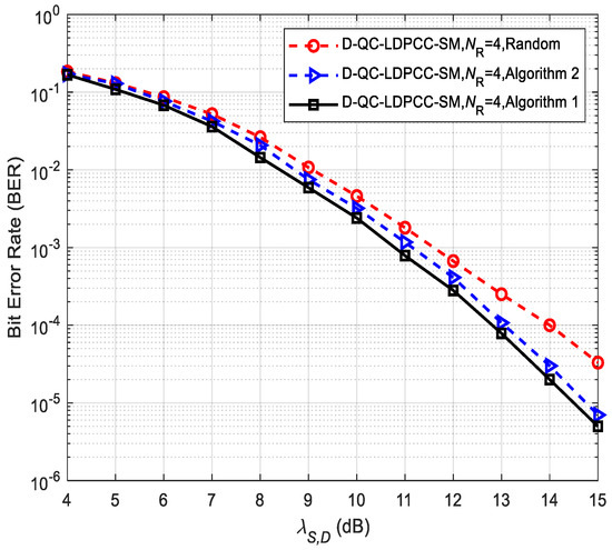 To explain the advantages of the proposed optimal and low-complexity information selection algorithms (i.e., Algorithms 1 and 2) over the random selection method, Figure 6 depicts the BER performance of the proposed scheme () with different selection approaches. The corresponding selection patterns are shown in Table 3. The joint BP iterative decoding algorithm is utilized to recover the message. From simulated results, it is noticed that compared with the system utilizing the random selection method, the scheme utilizing the two optimized algorithms provides better performance, which reflects the superiority of our proposed optimized algorithms. For example, at , Algorithms 1 and 2 outperform the random method by 1 and 1.2 dB, respectively. The reason why the random selection approach provides less performance than the proposed Algorithms 1 and 2 is that it generates the code with a smaller minimum distance of 3 at D over the others generating the same minimum distance of 6.