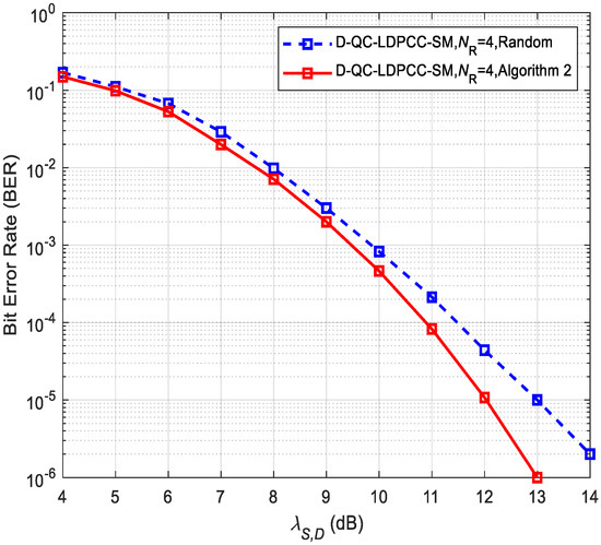 Moreover, the two optimized algorithms can obtain the approximate performance because they can achieve the code with nearly the same number of codewords with the minimum weight of 6 at D. Further, the complexity of Algorithm 2 is greatly reduced over Algorithm 1 by Equations (14) and (15). This reveals the design rationality of low-complexity Algorithm 2. Thus, for the case of the long block length codes, we only concentrate on the impact of Algorithm 2 on the system performance, as exhibited in Figure 7 and Figure 8. Table 3 lists the optimized and random patterns. In the simulations, and the joint BP iterative decoding algorithm are assumed. Due to the fact that the random selection method generates a smaller average minimum distance, it again shows the performance degradation of the random approach over Algorithm 2. For example, in Figure 7, the proposed scheme under the random method is about 1.2 dB worse than that under Algorithm 2 at . In Figure 8, the proposed scheme using the random approach has a 1 dB loss compared to the proposed scheme using Algorithm 2 at .
