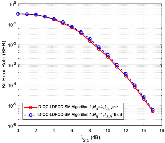 To observe the influence of the practical non-ideal S-R channel condition () on the system performance, we carry out the performance comparison for the proposed system in the ideal and non-ideal S-R channels, as shown in Figure 9 and Figure 10. The joint BP decoding algorithm is utilized. It is noticed that the performance under the non-ideal S-R channel is very close to that under the ideal S-R channel. For example, the non-ideal cases in Figure 9 and Figure 10 only have about 0.1 and 0.15 dB losses over the corresponding ideal cases. The results reflect the effectiveness of the proposed system in the realistic wireless channel link. Therefore, studying the proposed D-QC-LDPCC-SM scheme has important theoretical and practical significance.
