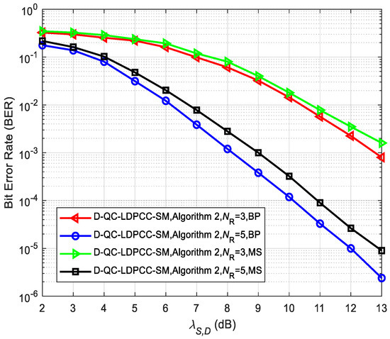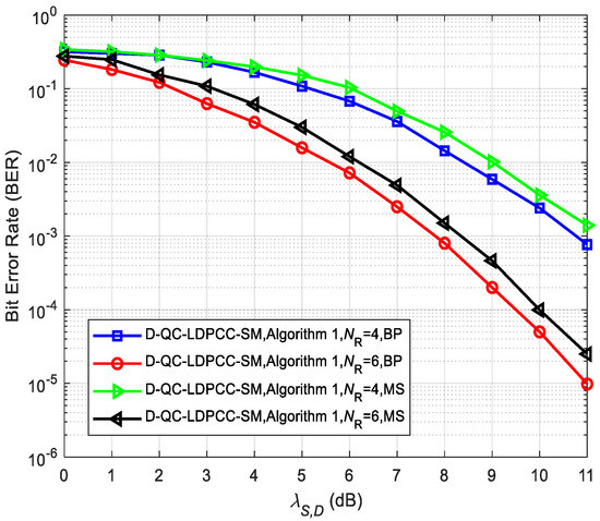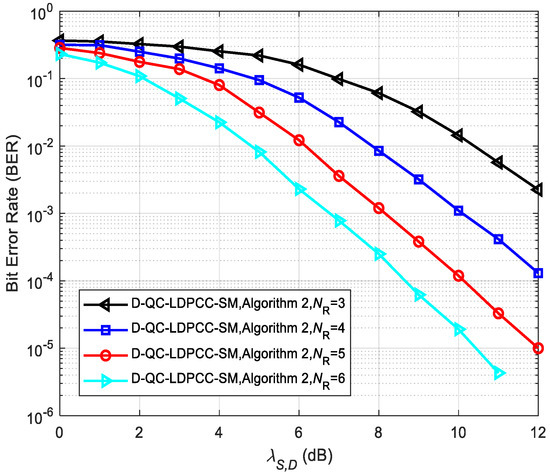 Figure 13 and Figure 14 describe the error performance of the proposed system () using the joint BP decoding algorithm with different receiving antenna numbers NR. As depicted in the simulated results, the increase in NR greatly improves the BER performance. For example, in Figure 13, the BER performance is with at SNR = 11 dB. For and 6, the BER performance under the same SNR is , and , respectively. In Figure 14, the BER performance of the proposed system under and 6 is , , and at SNR = 11 dB. This phenomenon shows that the configuration of more receiving antennas provides more diversity gain for the whole cooperative system, thus enhancing the error performance.