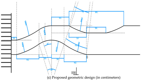 According to the geometry design standards and guidelines, the components of level road geometry consists of straight line, circular curve, and transitional curve. The cycle lane is viewed as an extension of the motor roadway, and the cycle lane’s width is usually lower than the motor vehicle lane [30]. The alignment of the cycle lane is redesigned to use straight lines and circular curves. In particular, the radius of the circular curve can regulate the design speed due to centrifugal force. If the radius is excessively large, the curvy road segment can be shortcut by straight traveling; if the radius is excessively small, the road segment can cause uncomfortable deceleration, even falling from bicycles. Thus, the proposed geometry was drafted by trial and error in the field.