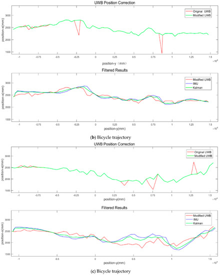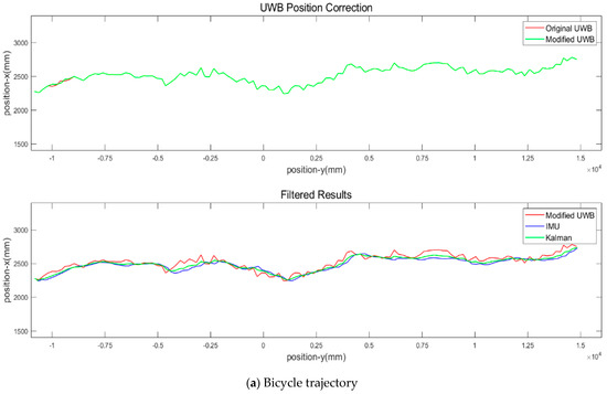 Based on Equation (6), the gap between the UWB measurements and the INS dead reckoning prediction is calculated. If the gap is significantly high, this study assumes that IMU is more reliable due to its electromagnetic wave immunity. The blunders, especially the off-track points, are removed on a quantile basis, with the faulty ones filled by the IMU positioning results. The results are compared with CODA positioning data, and the root mean square error (RMSE) is approximately 20 cm [32]. It is within adult pedestrians’ 50 cm × 60 cm ellipse dimension [33]. Thus, the filtered results can track the entangled trajectories of active mode travelers when yielding and following closely. The SSHAKF is implemented to enhance positioning precision. The smoother field results indicate the more realistic trajectory results for human-powered low-mobility bicycles, presented in Figure 4:
