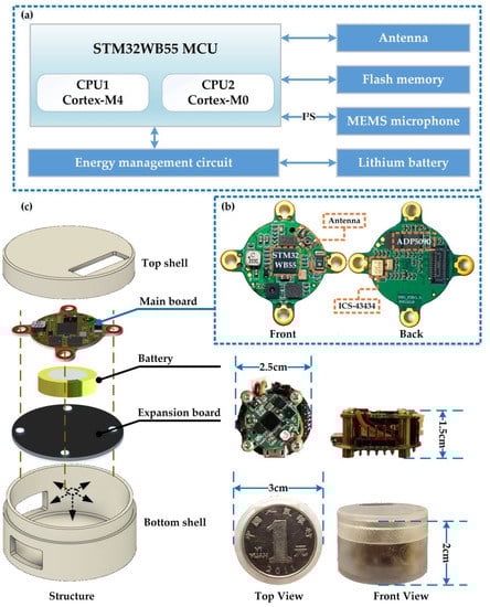 The hardware of the intelligent microsystem consists of four basic units: the sensing module, the processing module, the wireless transceiver module, and the power supply module. The composition of the microsystem is shown in Figure 2a. The selected main MCU is a low-power processor containing a Bluetooth chip for data processing and transmission. A MEMS microphone is used to capture sound signals and send sound data to the MCU using the I2S interface. An antenna for RF communication is integrated. The power supply module consists of a lithium battery and a supporting energy management circuit.