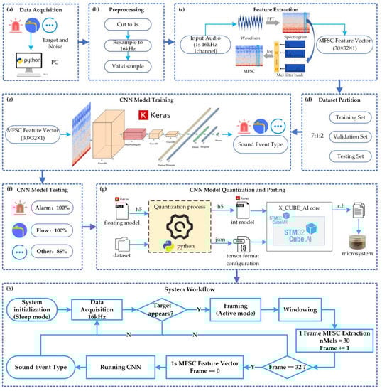 To optimize the software workflow of the microsystem, given the limited hardware resources and sound event recognition performance, several steps have been taken. These include system initialization, event initial detection, system work mode switching, preprocessing, feature extraction, and event recognition, as depicted in Figure 3h.