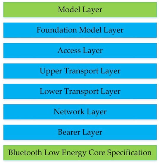 BLE mesh is a Bluetooth Low Energy-based networking specification published by Bluetooth SIG []. It uses the “flooding” method [] and the publish/subscribe mechanism [] to transmit messages. There are different types of nodes: relay, proxy, friend, and low-power. Relay nodes retransmit received messages, and they enable multiple “hops” in the network. Proxy nodes expose the interface for a smartphone or other devices to interact with the mesh network. A BLE mesh network has a theoretical maximum of 32,767 nodes and up to 126 hops []. BLE mesh defines four address types, three of which are used for message delivery: unicast addresses, virtual addresses, and group addresses []. The architecture of BLE mesh is shown in Figure 5, where the model layer defines the functions and behaviors of the nodes []. From the control perspective, the models can be divided into Server, Client, and Control models. Server models expose their state to other models, Client models can access the state of Server models, and Control models are a combination of them. From the functional perspective, there are Generic models, Lighting models, Sensor models, and Vendor models.