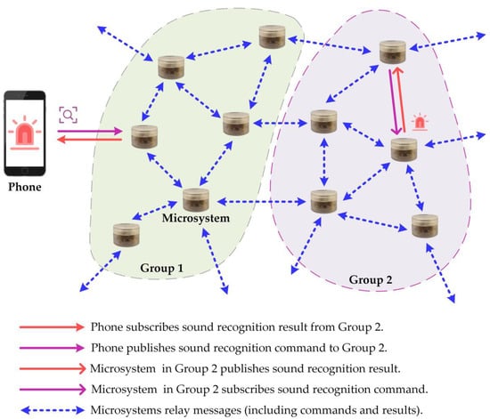 As depicted in Figure 6, a mesh network is formed by several microsystems and mobile phones, which are divided into two groups. In this configuration, Group 2 receives sound event recognition instructions from the phone and subscribes to the sound event recognition results. The sound recognition command is transmitted to the proxy microsystem that is directly connected to the phone. The “command” message is then relayed to the microsystem of Group 2 using several microsystems. The microsystem of Group 2 subscribes to the recognition command, performs sound event recognition locally, and publishes the sound event recognition results. The “recognition results” message is then relayed to the phone via several microsystem relays, enabling sound event monitoring.