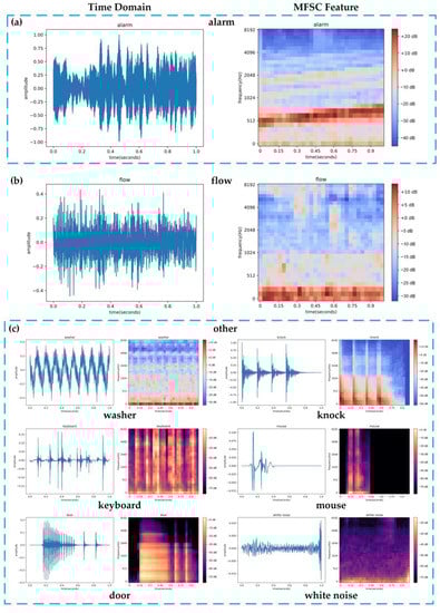Three sound samples, namely an alarm sound (shown in Figure 8a), a water flow sound (shown in Figure 8b), and noise samples (shown in Figure 8c), were randomly selected from the experimental dataset. The time domain distribution and MFSC features of these sound signals are presented in Figure 8.