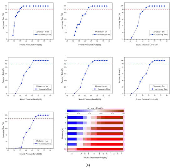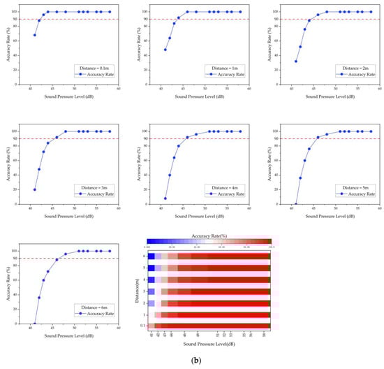 In the sound event recognition experiment, 25 alarm audios and 25 water flow audios from the dataset described in Section 3.1.1, each 5 s long, were used as experimental samples. The microsystem’s recognition accuracy was tested indoors at different distances from the sound source and with different sound intensities, as shown in Figure 7a.
