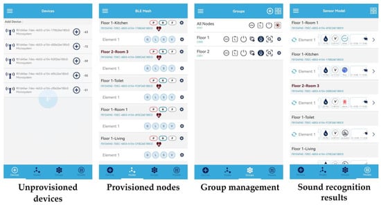 Figure 10 illustrates the interaction process between the smartphone and the microsystem sensing network, which proceeds as follows: scanning the unprovisioned microsystems, configuring them as network nodes, controlling them by group, and receiving the sound event recognition results from the microsystems. From anywhere in the house, the smartphone could monitor the sound event recognition results of all microsystem nodes in real time. The smartphone could also control this meshed network in a flexible manner, such as controlling a microsystem individually, controlling multiple microsystems in groups (e.g., by floor), or controlling all microsystems in the house. This demonstrates that the end-to-end meshed network based on BLE mesh and the microsystems has good topological flexibility and network scalability while also effectively extending the detection range.